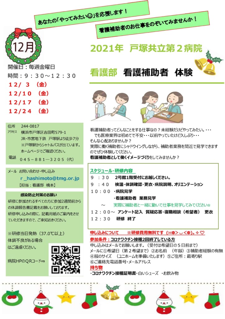 【お知らせ】看護部 看護補助者体験研修のお知らせ(2021年12月)