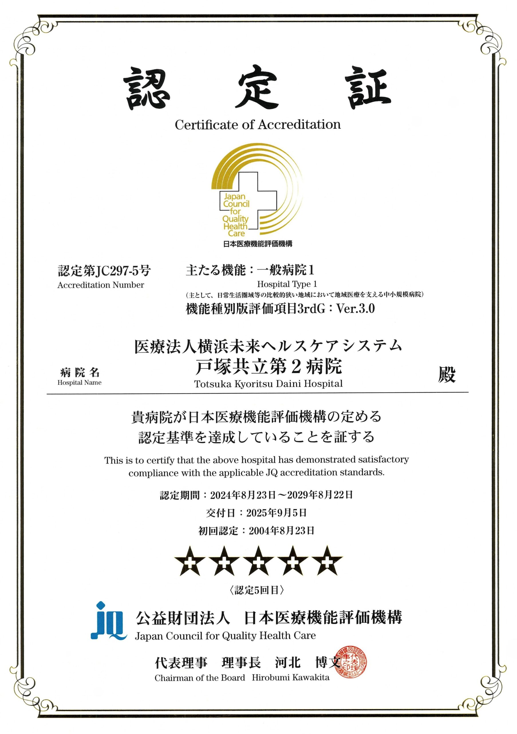 病院機能評価の認定を受けていることは、一定レベル以上の医療機能を備えていることの証明となるとともに、第三者評価の過程で、病院内の問題点や課題も明らかとなり、医療機能の更なる改善につながります。 当院は、2024年8月に病院機能評価(3rdG:Ver.3.0)の認定を取得いたしました。